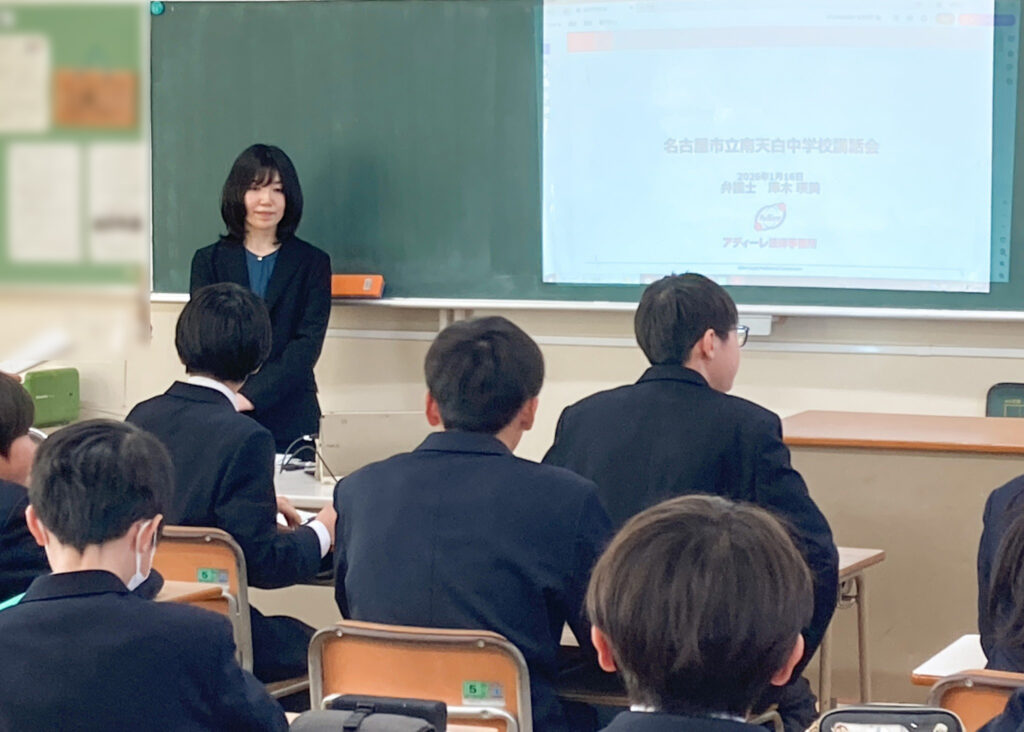 アディーレ法律事務所は、未来を担う子どもたちの「知らないことで損をする状況」をなくす「子どもたちを守る法教育プロジェクト」の一環として、1月16日(金)に名古屋市立南天白中学校にて職業人講話「職業を知る」を実施しました。